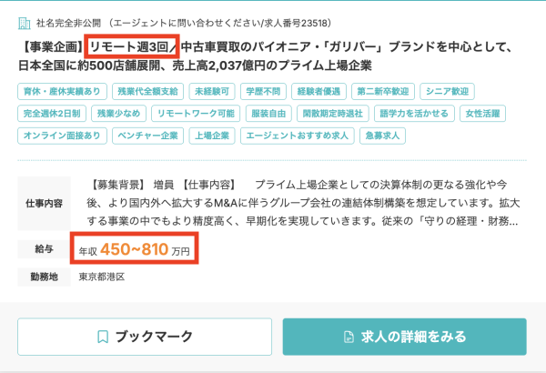 ↑上場企業の経理ポジションながら、リモートワークが週3日可能というワークライフバランス重視の求人です。