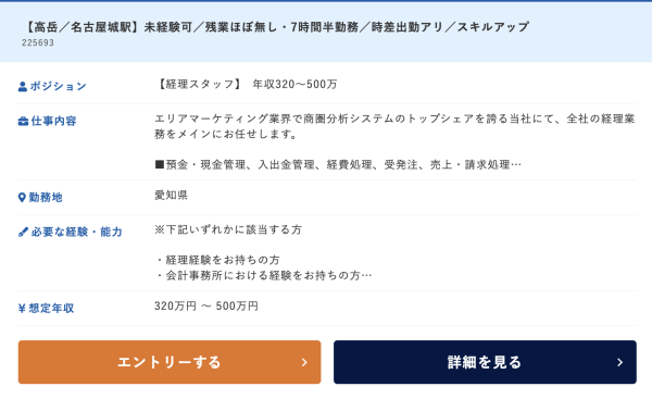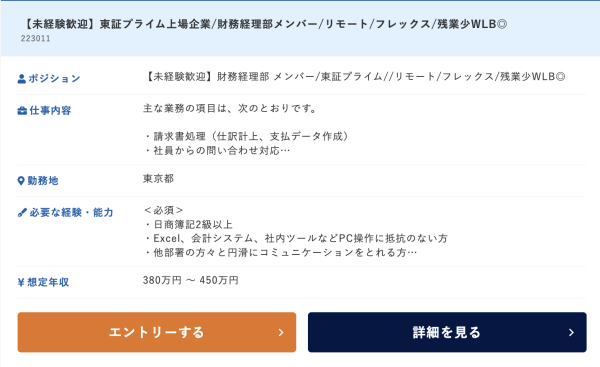 無料登録のみで条件(残業ゼロや年収400万円以上など)を細かく指定して求人検索をかけられますので、まずはいろんな経理未経験求人を見てみてください。