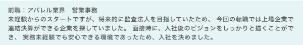 前職はアパレル業界の営業事務。経理は未経験でしたが、将来的に監査法人を目指して上場企業を希望。