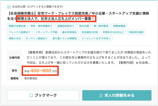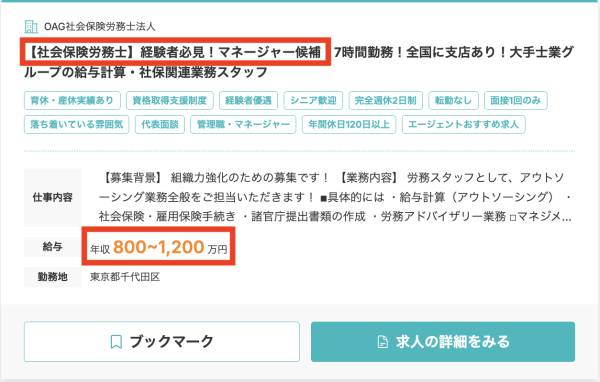 ↑こちらは社労士としてハイキャリアを目指す人向けの求人です。
