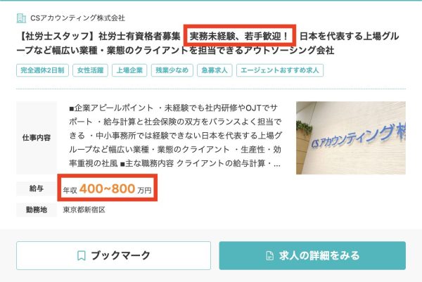 ↑社労士資格を取ったばかりの人で、これから社労士としての実務経験をゼロから積みたい人におすすめの求人です。